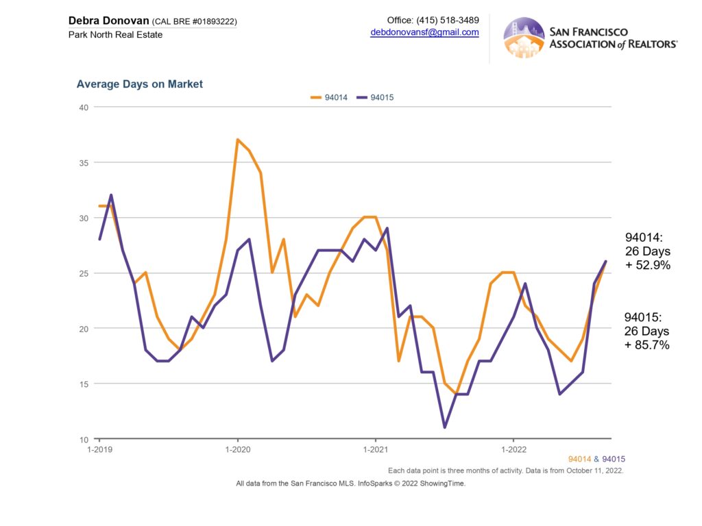 The average days on market for homes in zip codes 94014 and 94015 increased to 26 days on the market before accepting an offer. In Q3 of 2021 homes were on the market for an average of 17 and 14 days respectively. So while 26 days may seem quick to many parts of the country, it’s an increase for here in the Bay Area markets.